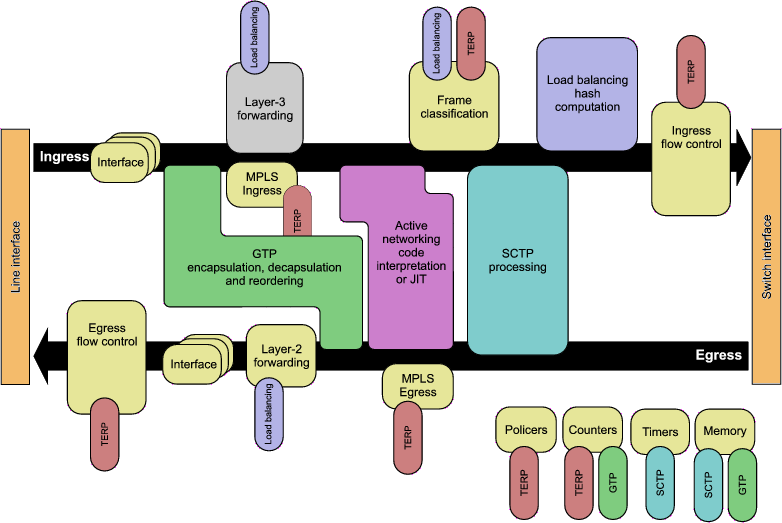 TERP: IBM PowerNP Traffic Engineering Reference PlatformThis project highlights how the Network Processor (NP) is used in the context of Traffic Engineering (TE), from both the data plane and the control plane point of view. Our implementation of TE relies on RSVP-TE (Resource reSerVation Protocol, Traffic Engineering extensions) to set up MPLS (Multi-Protocol Label Switching) paths (or LSP, for Label-Switched Path) through the network and on DiffServ to provide Quality of Service (QoS). An OSPF (Open Shortest Path First) routing mechanism with specific TE extensions is used to collect QoS-usage information throughout the network. Our own Route Server component computes paths on request from RSVP. TE permits ISPs (Internet Service Providers) to start offering value-added commercial-grade services. Each MPLS node is composed of one or more NPs, interconnected with a switching fabric and attached to a Control Point (CP): these NPs and the CP together act as a single MPLS node.